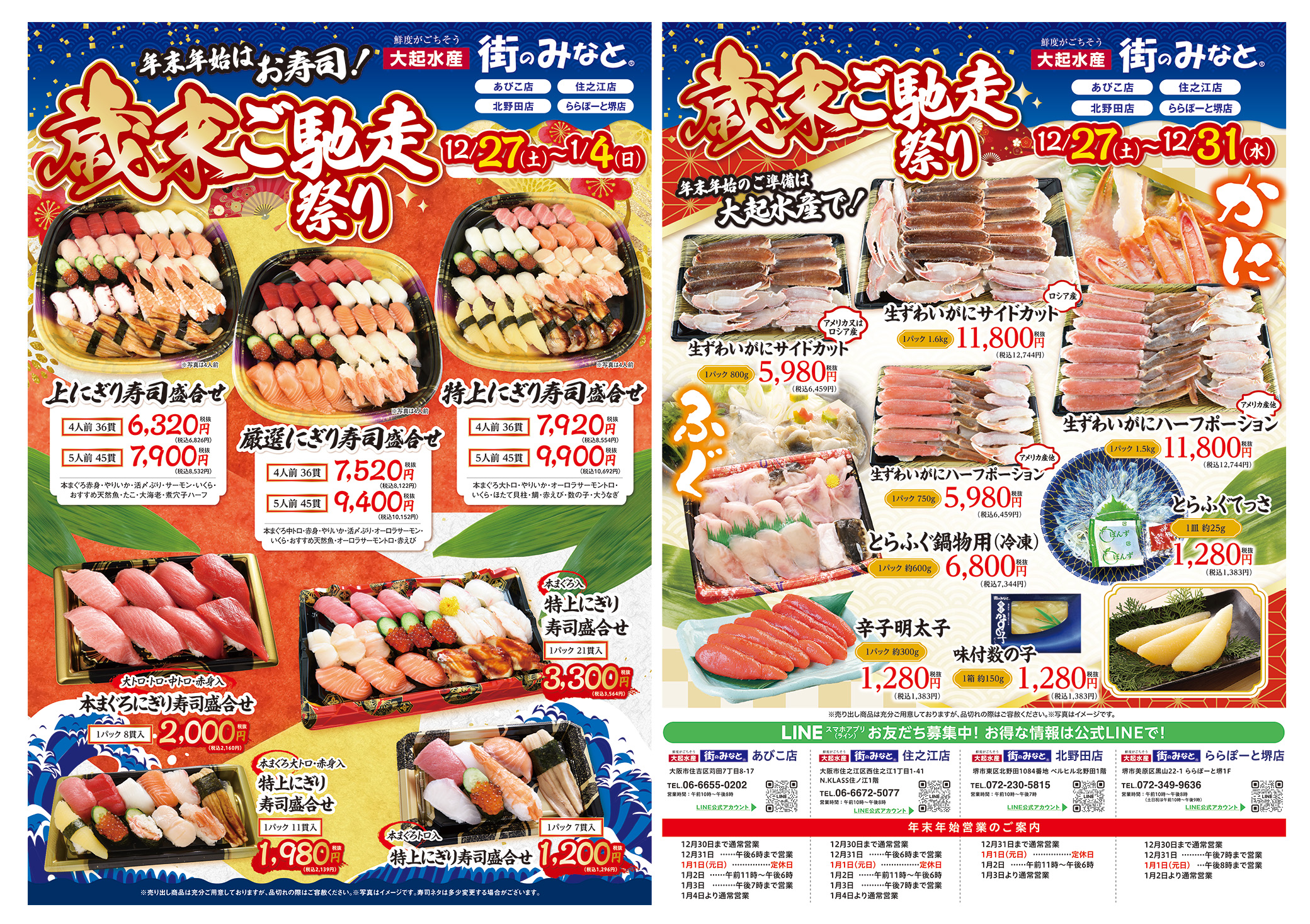 ・街のみなと あびこ店・住之江店・北野田店・ららぽーと堺店は、1/1(木)は定休日です。
