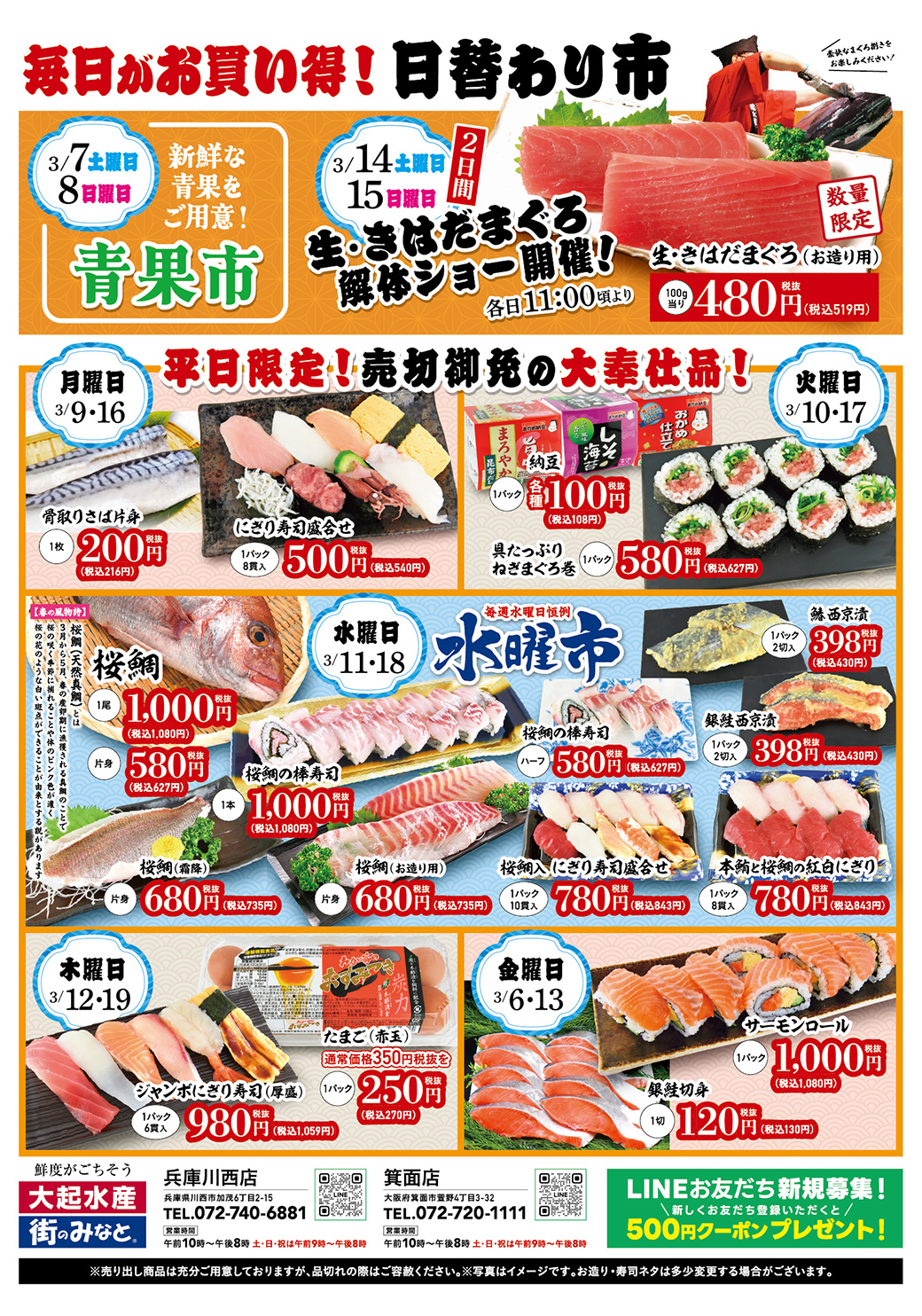 土日の「生・きはだまぐろ解体ショー」や水曜恒例の「桜鯛の水曜市」など、