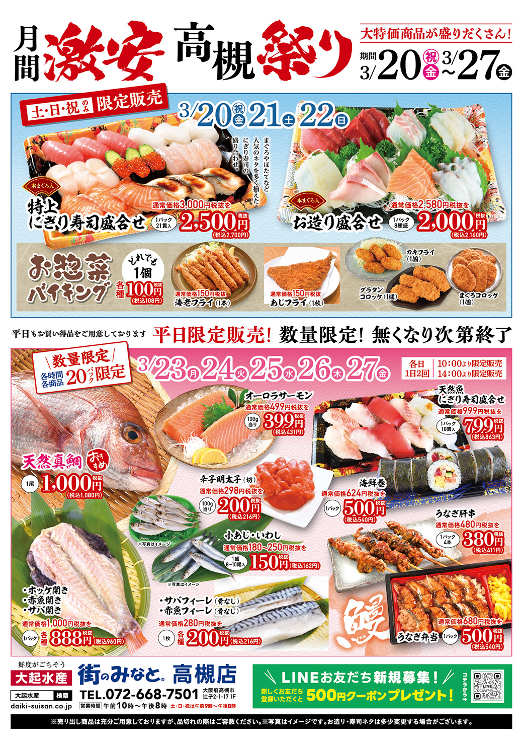 各時間20パック限定の「天然真鯛」や、脂の乗った「オーロラサーモン」、