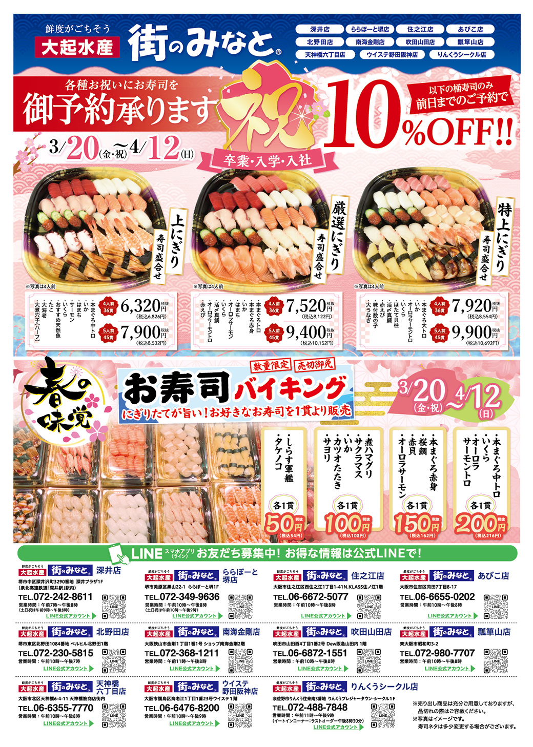 3月20日から4月12日までの期間、店頭では「お寿司バイキング」を実施いたします。