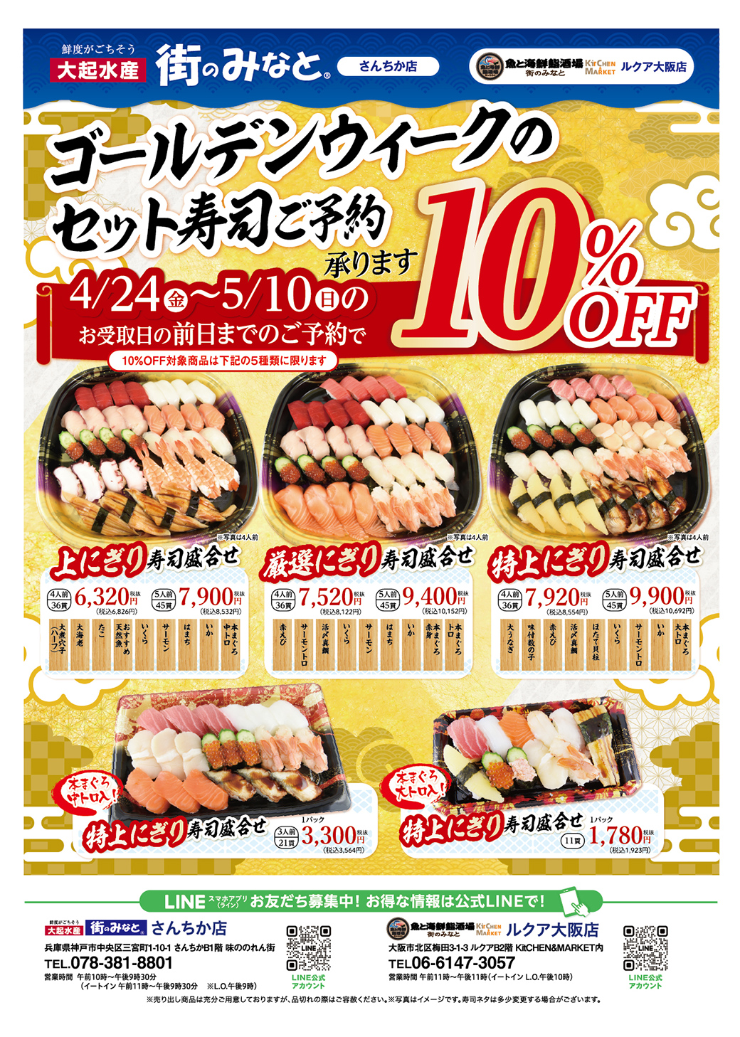 【街のみなと さんちか店・ルクア大阪店限定】生・本まぐろ祭り&GWセット寿司ご予約10%OFF開催!【4月24日(金)~5月10日(日)】