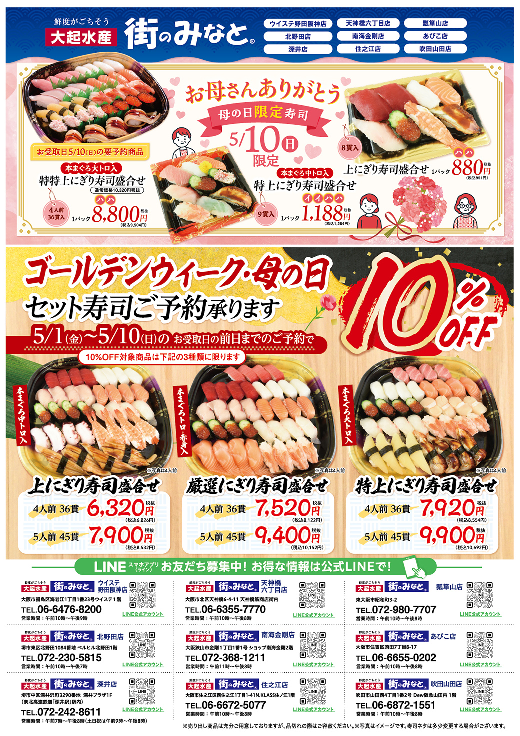 受取日の前日までにご予約をいただいたお客様に限り、対象の寿司盛合せを 10%OFF の特別価格にてご提供いたします。